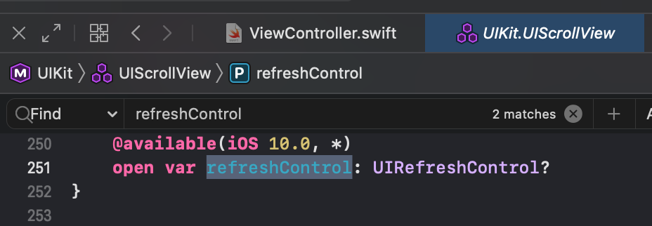 아래 그림처럼 UITableView 클래스가 상속하는 UIScrollView 클래스에는 UIRefreshControl 변수가 존재합니다.