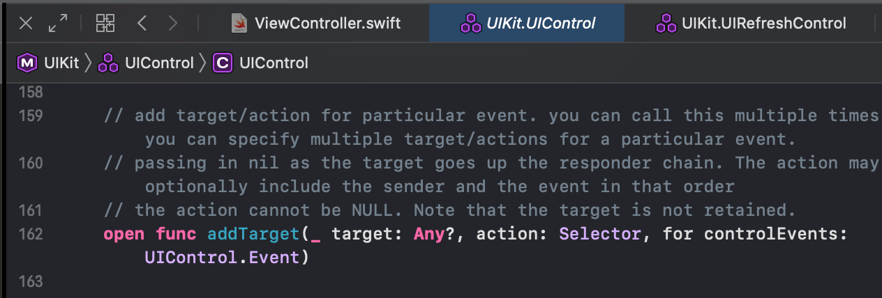 아래 그림처럼 UIRefreshControl 클래스가 상속하는 UIControl 클래스에는 addTarget 함수가 존재합니다.