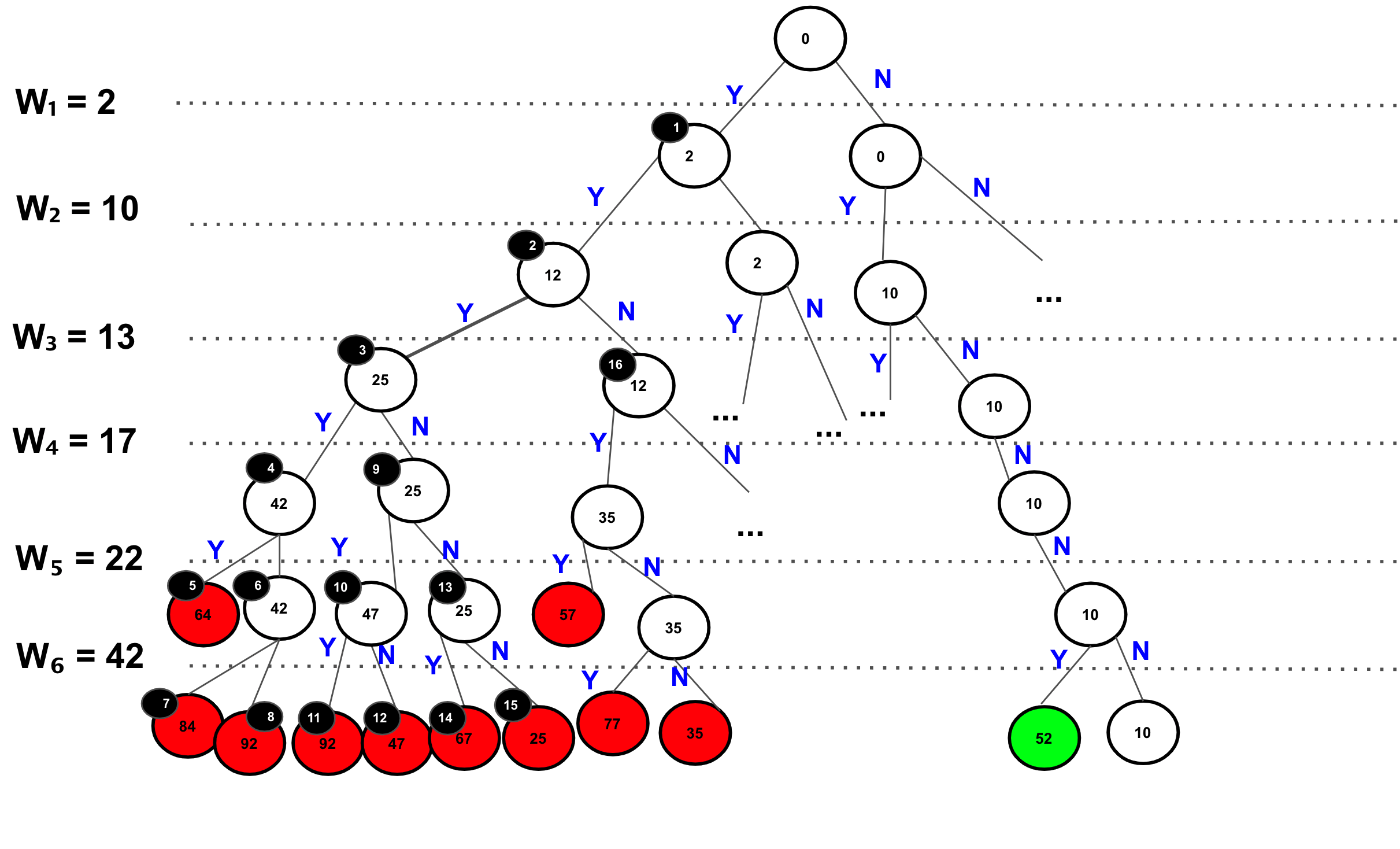 아래 트리에서 각 단계의 가지는 w₁ , w₂ , w₃ , w₄ , w₅ , w₆ 숫자를 의미한다. 루트 트리의 값 0부터 이동을 시작하여 연결된 가지에 해당하는 수를 더하거나(Y), 무시하고(N) 지나간다.