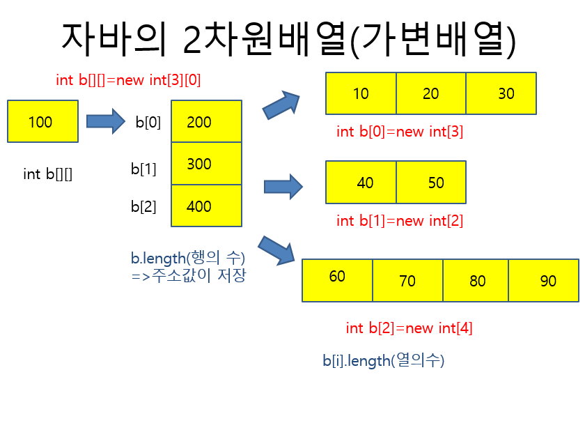 위와 같이 선언할 수 있는 이유는 2차원 배열에서 1차원에는 2차원 배열의 주소를 가지고 있기 때문이다. 때문에 new int[2][0] 처럼 1차원 크기만 미리 정하면, 2차원의 크기는 이후에 정할 수 있다.
