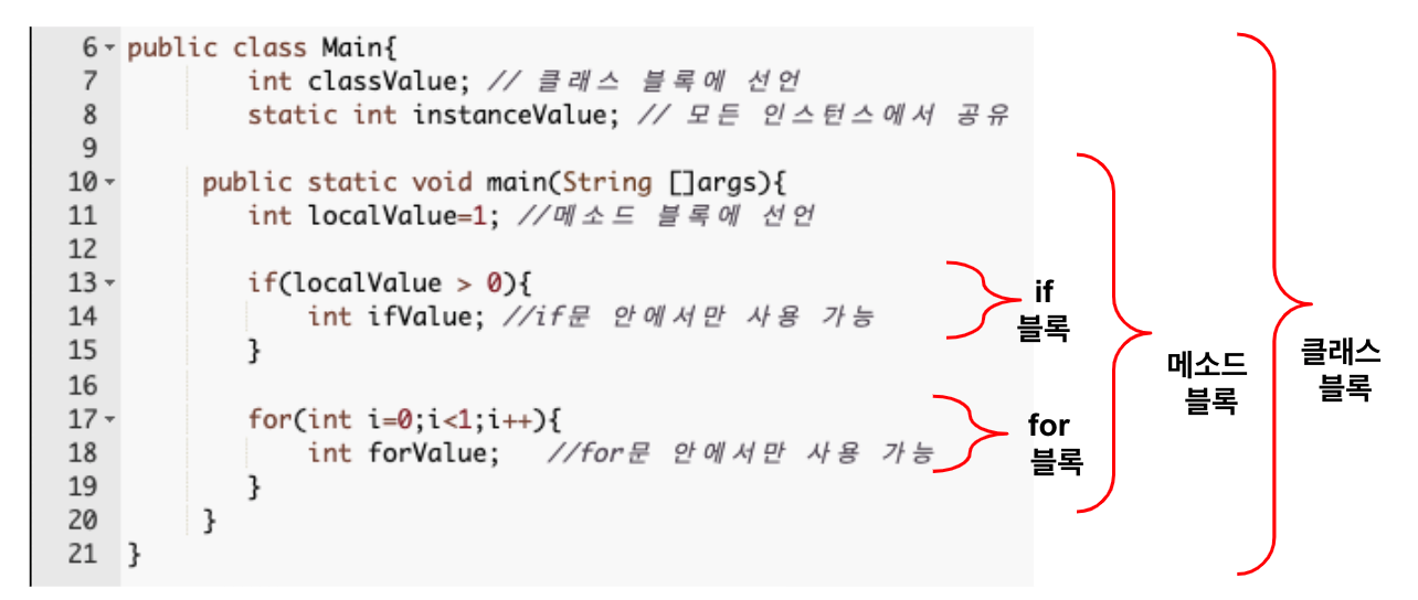 변수는 중괄호 {} 블록 내에서 선언되고 사용된다. 중괄호 블록을 사용하는 곳은 클래스, 메소드, 제어문이있다. 변수는 블록 내 어디에서든 선언할 수 있고, 선언된 블록 내에서만 사용이 가능하다.