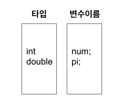 자바는 아래와 같이 변수를 선언한다. 타입은 변수에 저장되는 값의 종류와 범위를 결정하고, 변수이름은 메모리 주소에 붙여진 이름이다.
