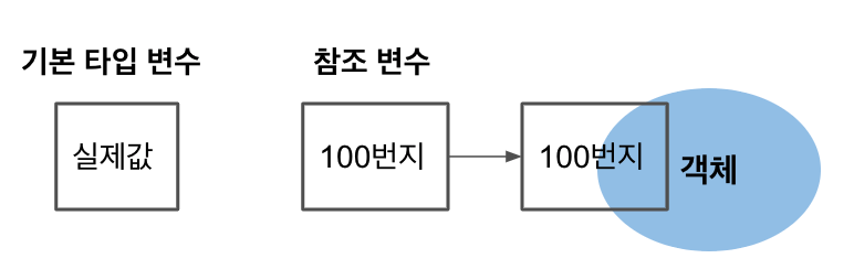 기본 타입과 참조 타입으로 선언된 변수의 차이점은 저장되는 값이다.기본 타입으로 선언된 변수는 실제 값을 변수 안에 저장하고,참조 타입으로 선언된 변수는 메모리의 주소를 값으로 갖는다. 주소를 통해 객체를 참조한다는 뜻에서 참조 타입이라고 한다.