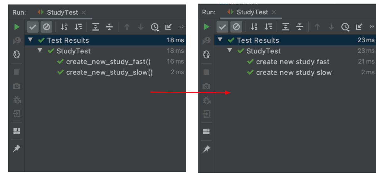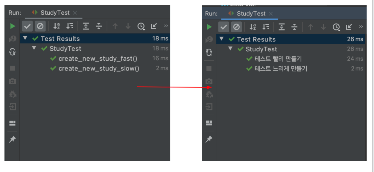 위 테스트의 결과로 아래와 같이 테스트 메서드 이름이 출력됩니다.