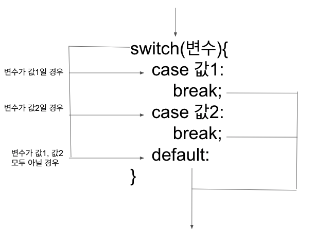 실행로직: switch문은 괄호 안의 값과 동일한 값을 갖는 case로 가서 실행문을 실행시킨다. 만약 괄호 안의 값과 동일한 값을 갖는 case가 없으면 default로 가서 실행문을 실행시킨다. default는 생략 가능하다. case 끝에 break가 붙이면 다음 case를 실행하지 않고 switch문을 빠져나간다.