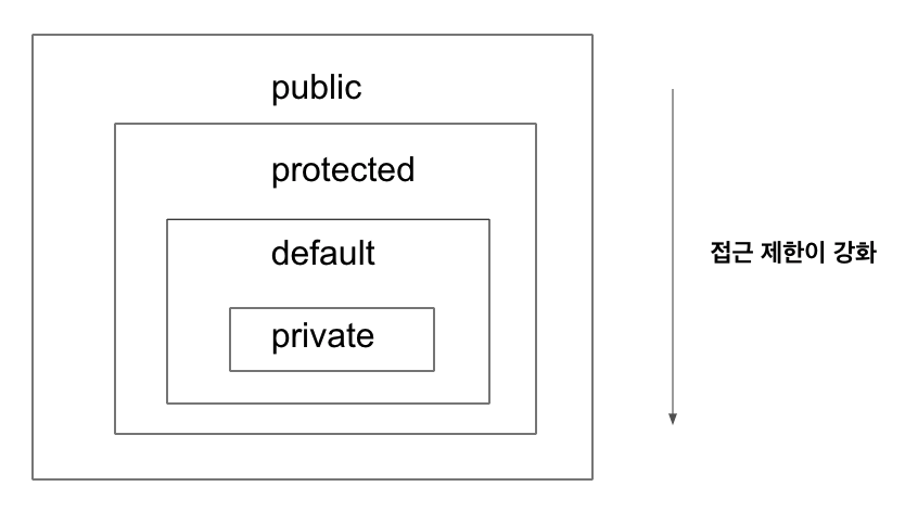 | private | 필드, 생성자, 메소드 | 모든 외부 클래스 |