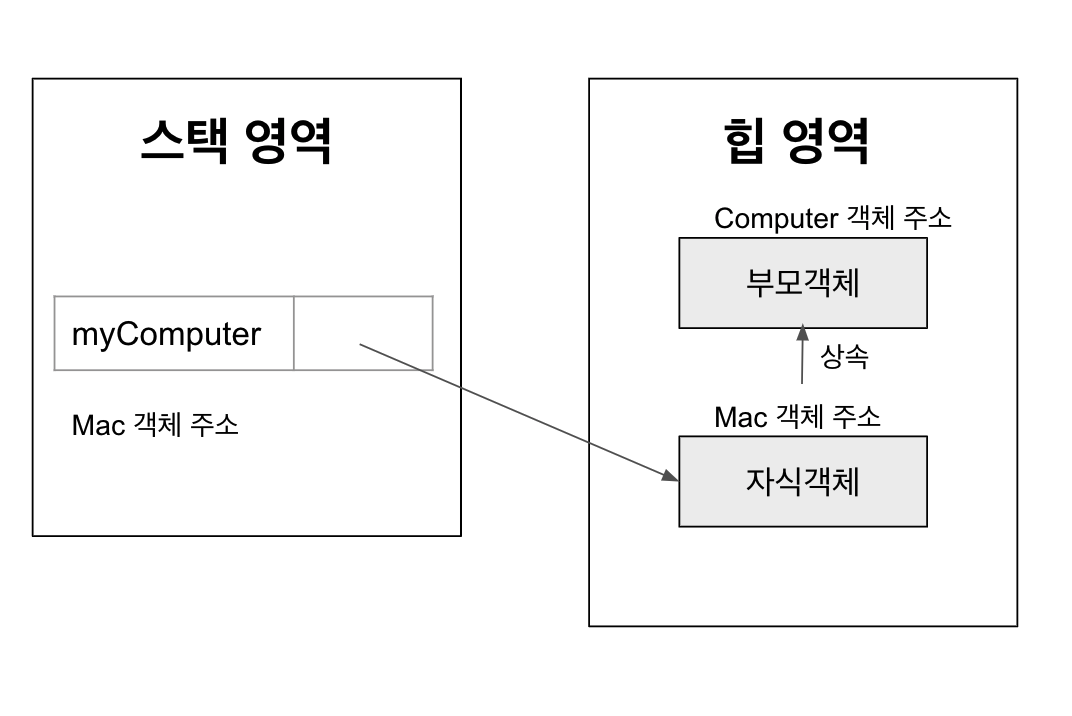위 코드 처럼 상속 관계가 성립되면, 부모 클래스로 선언된 변수를 자식 클래스로 초기화할 수 있다.