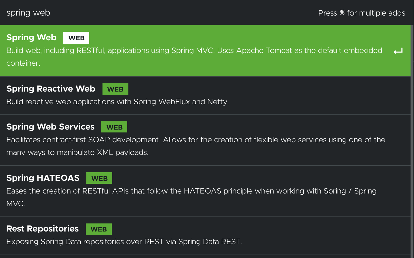 Spring Web을 선택합니다. ‘Gradle로 스프링부트 추가하기’에서 명시적으로 추가했던 spring-boot-start-test는 여기서 선택하지 않아도 자동으로 추가됩니다.