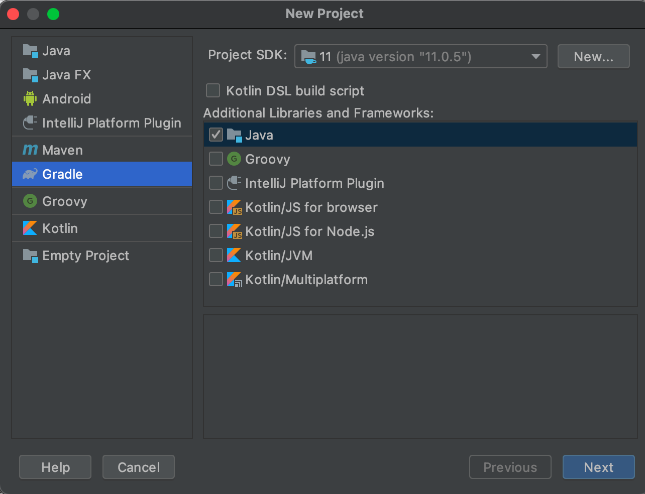 프로젝트 종류로 Gradle을 선택하고 Next 버튼을 클릭합니다.