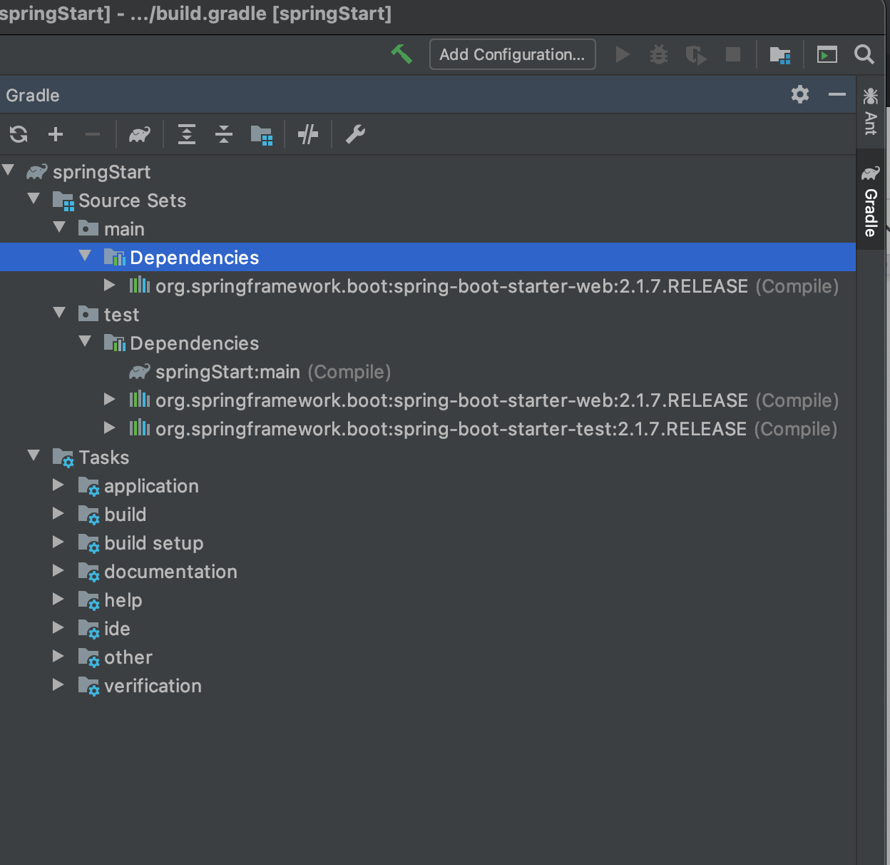 의존성 다운로드가 완료되면 인텔리제이 우측의 Gradle 탭을 클릭하여 의존성이 올바르게 다운로드 되었는지 확인할 수 있습니다. main 디렉토리에는 spring-boot-start-web이, test에는 spring-boot-start-test 의존성이 다운로드된 걸 확인할 수 있습니다.
