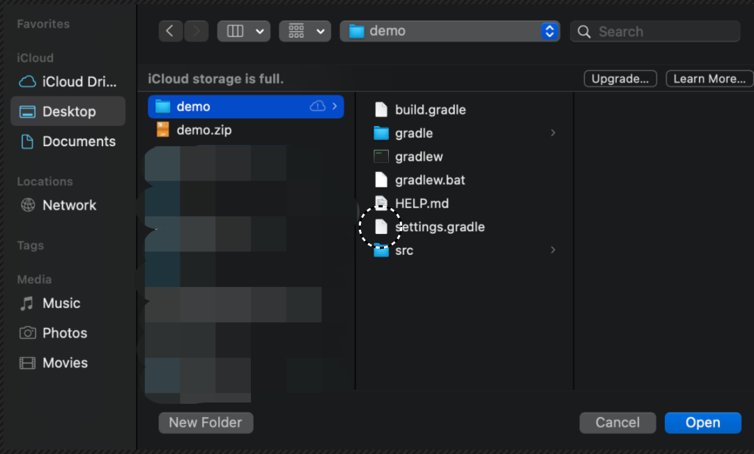 마지막으로 스프링 이니셜라이저로 생성한 프로젝트 디렉토리를 선택하고, Open 버튼을 클릭합니다.