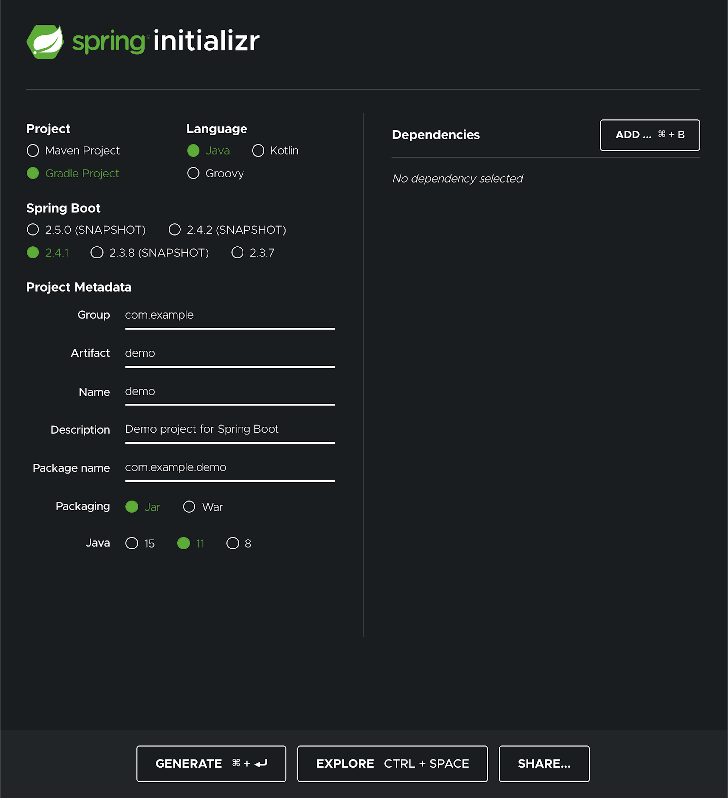 먼저 다음 링크로 이동합니다. https://start.spring.io/
