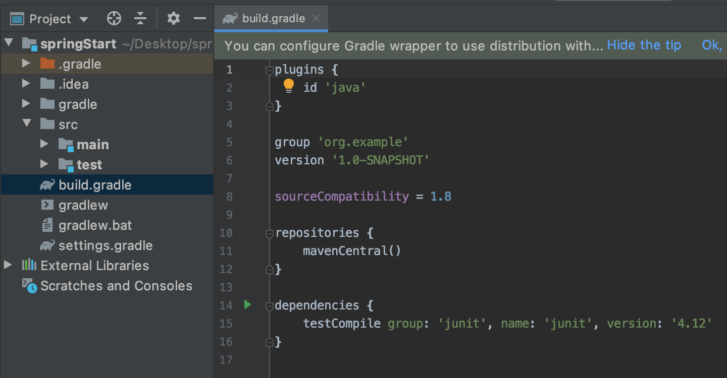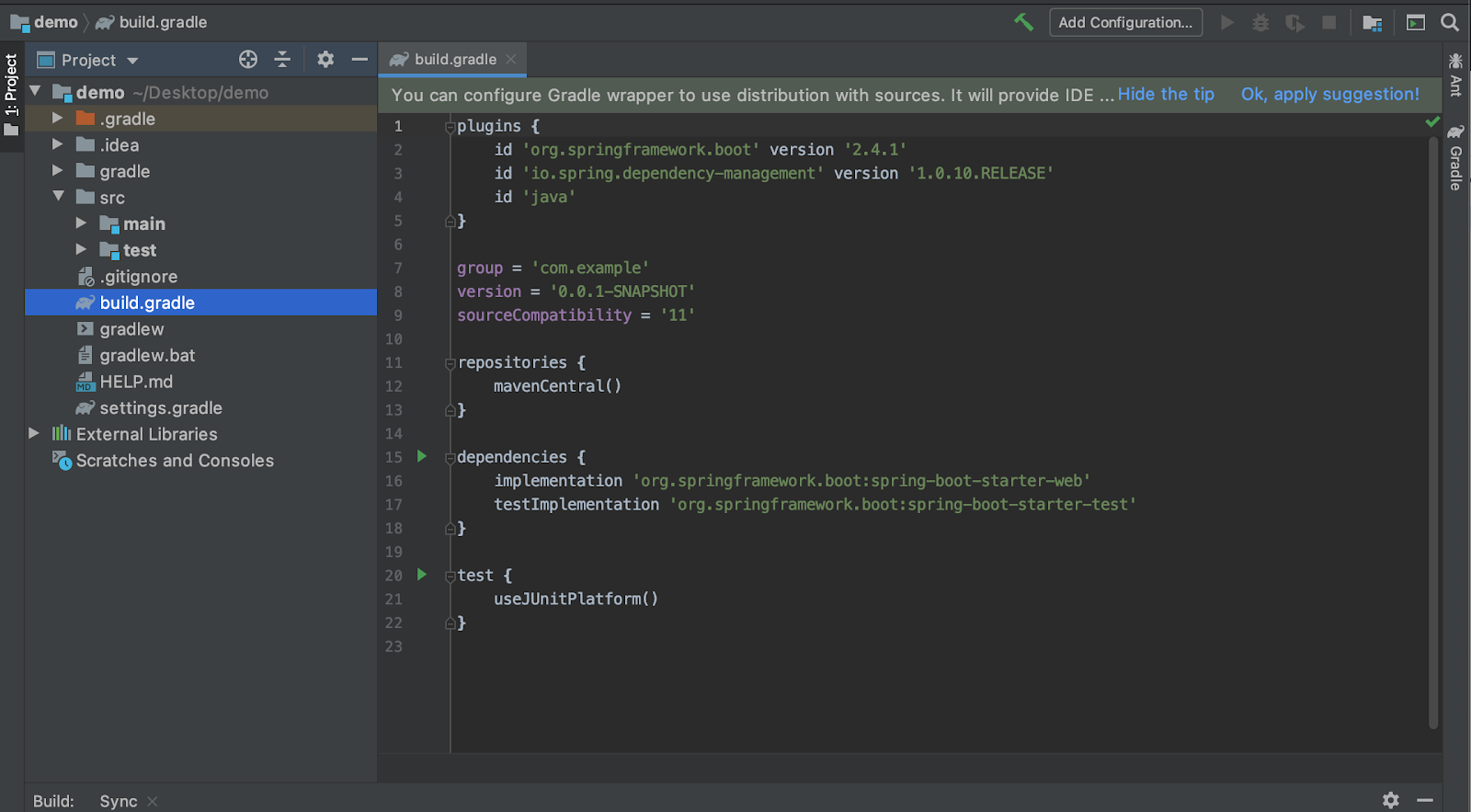 생성한 프로젝트의 build.gradle 파일을 열어보면, 다음과 같은 내용을 볼 수 있습니다.
