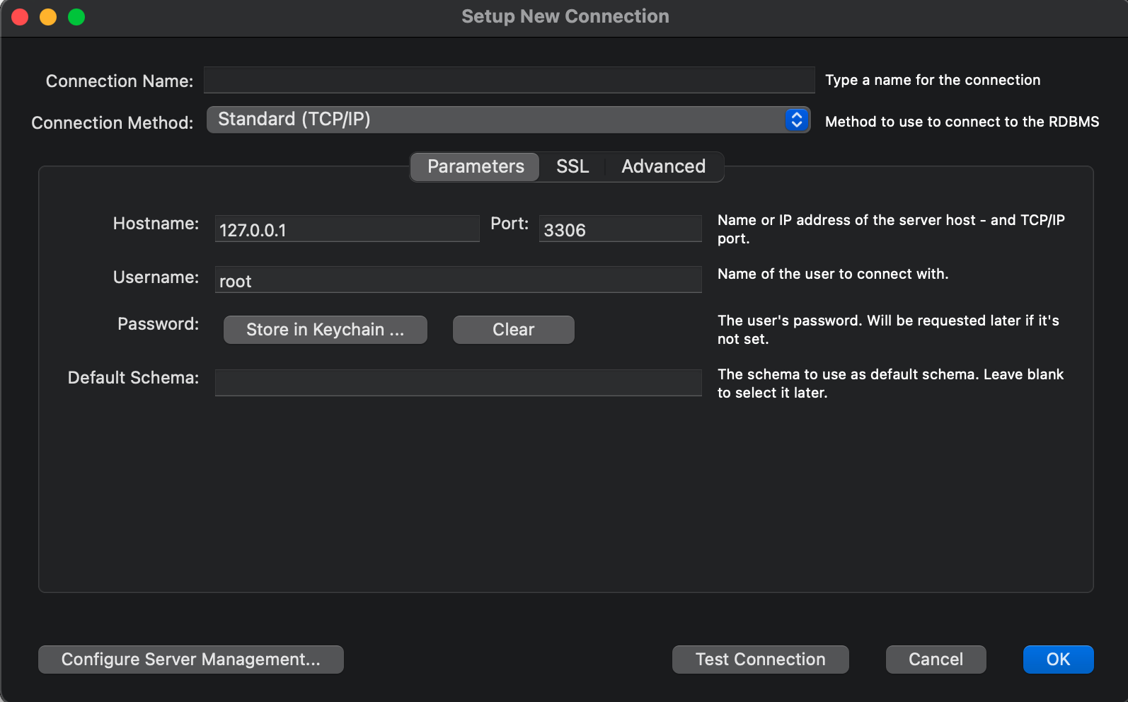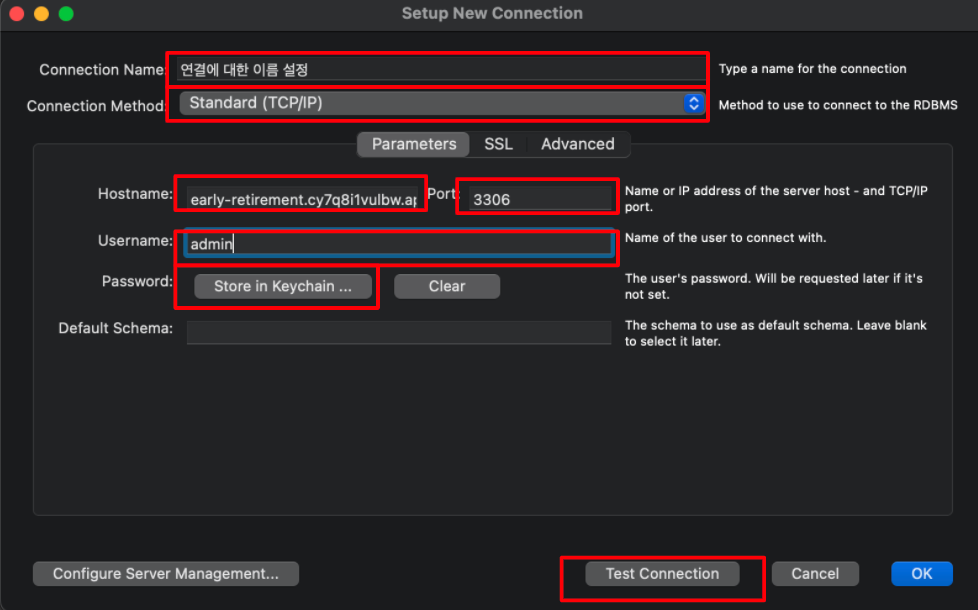 다시 MySQL 워크벤치로 돌아와서 `Setup New Connection` 화면에 연결을 위한 값들을 입력합니다.