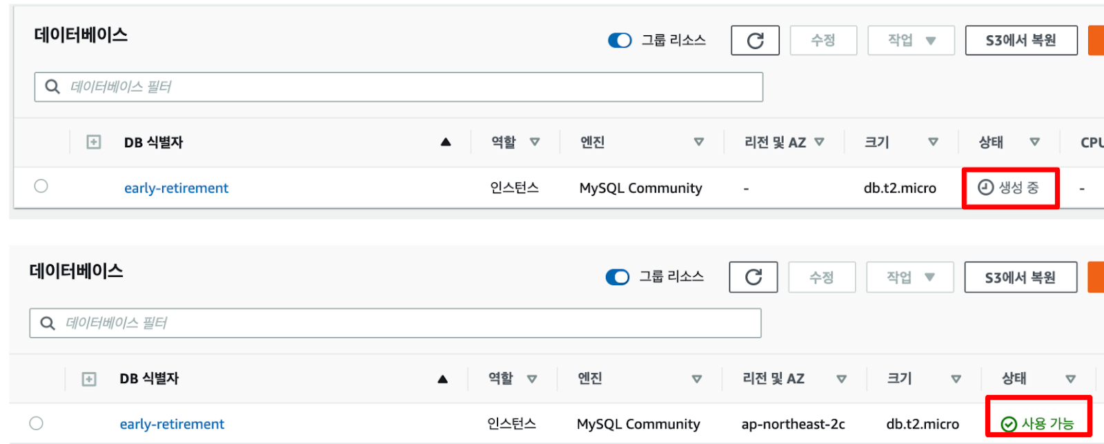 생성 버튼을 클릭하면 아래와 같은 페이지로 이동합니다. 데이터베이스의 상태가 `생성 중`에서 `사용 가능`으로 바뀌면 이때 부터 데이터베이스를 사용할 수 있습니다.
