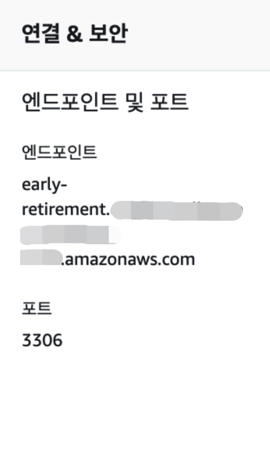 이동한 페이지에서 연결 & 보안 - `엔드포인트`의 주소를 기억해둡니다. IP 주소를 입력할 때 사용됩니다.