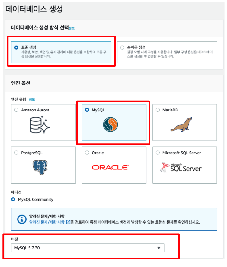 데이터베이스 생성 방식 선택 - 표준 생성을 선택하고, 엔진옵션 - MySQL 그리고 버전은 5.7.30을 선택합니다. (원하는 종류의 데이터베이스가 있다면, 해당 데이터베이스를 선택하셔도 무방합니다.)