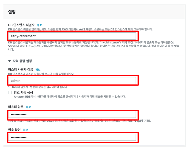 설정 항목에서 DB 인스턴스 식별자, 마스터 사용자 이름, 비밀번호를 입력합니다.