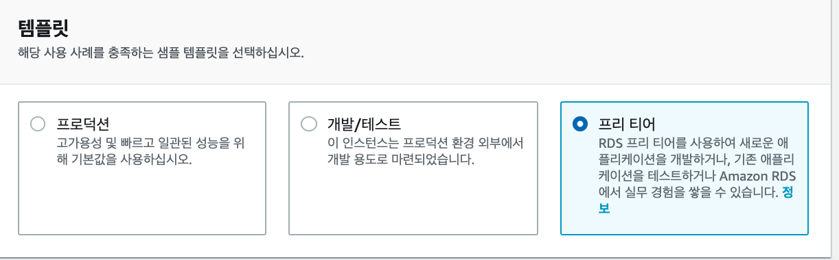 템플릿 - 프리티어를 선택합니다. (AWS 회원가입을 하면 1년 동안 프리티어 사용이 가능합니다.)
