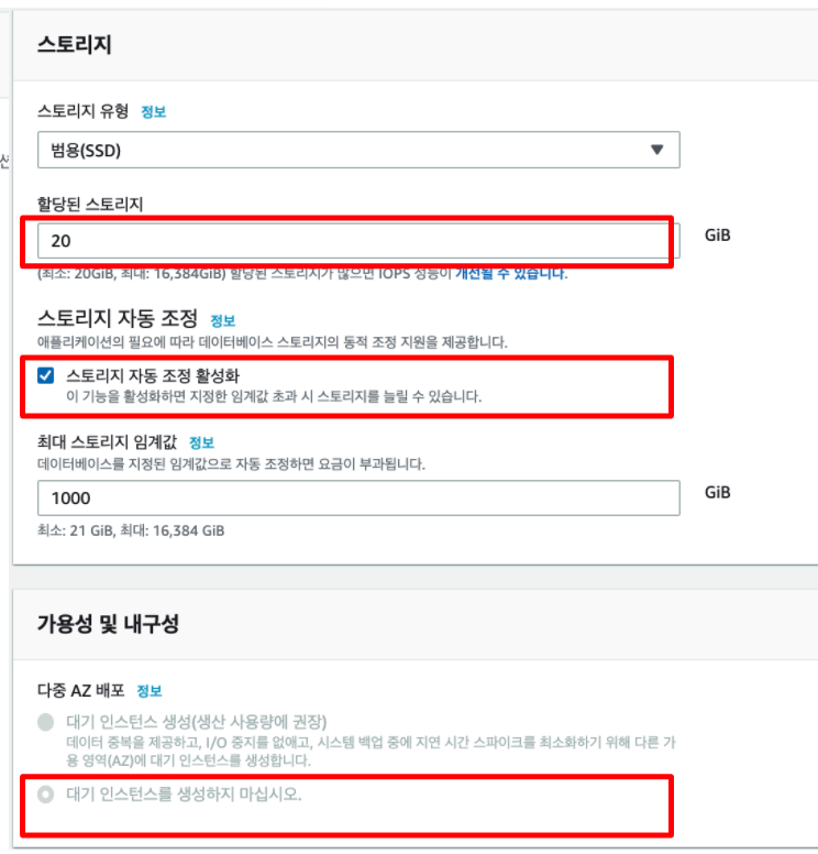 가용성 및 내구성 - ‘대기 인스턴스를 생성하지 마십시오’를 선택합니다.