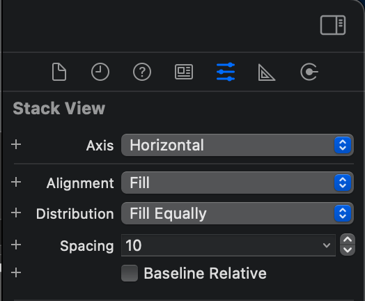 그리고 Xcode 우측의 Inspectors에서 Stack View 내부에 View 들에 대한 속성을 조절할 수 있습니다.