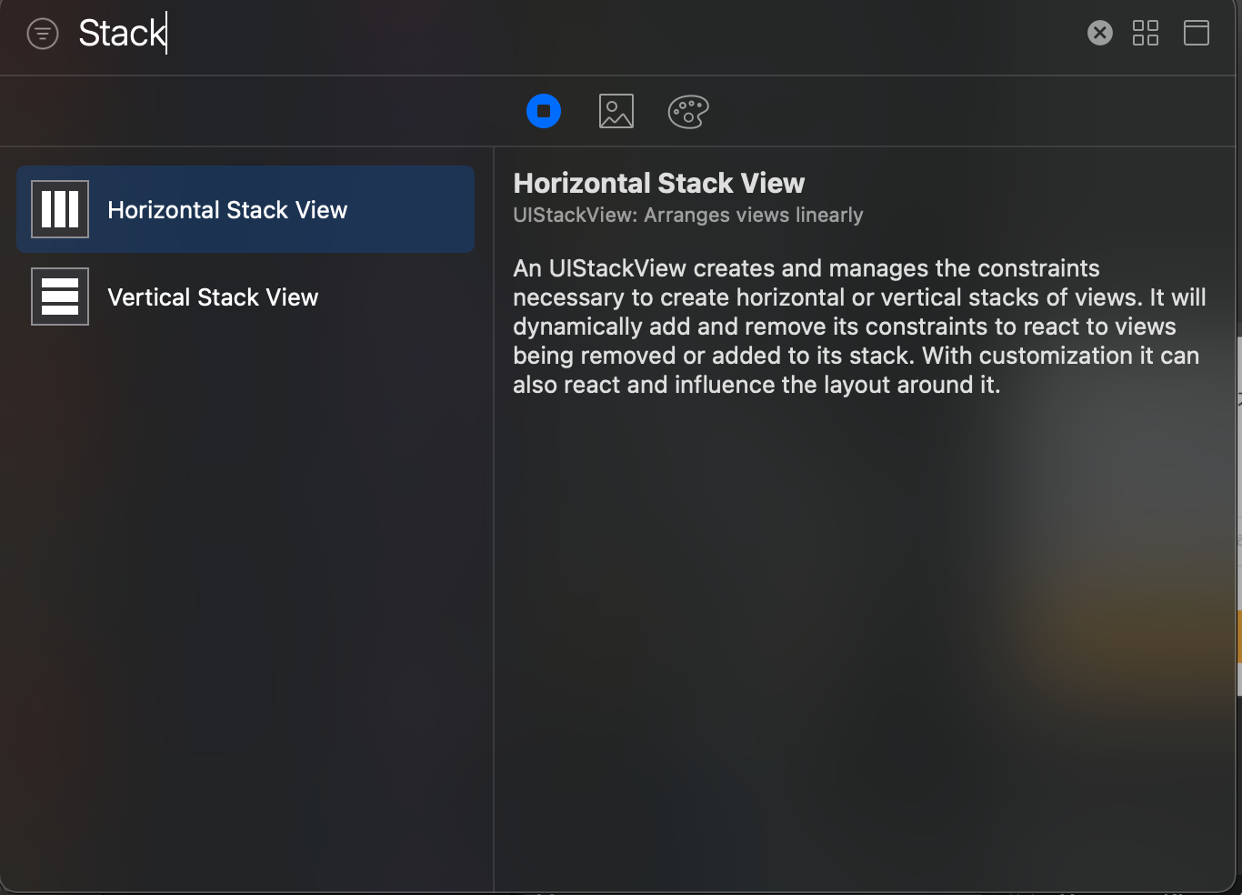 Xcode의 스토리보드에서 UIStackView를 검색하고, Scene에 추가합니다. 여기서 Horizontal Stack View는 여러 개의 View를 가로 방향으로 관리합니다. 반대로 Vertical Stack View는 세로 방향으로 View들을 관리합니다.