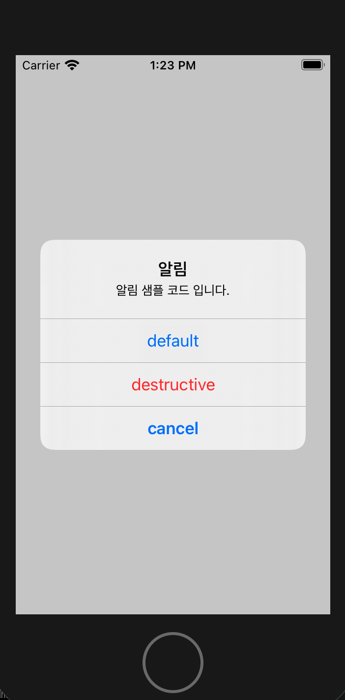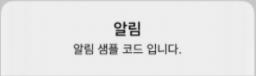 let alert = UIAlertController(title: "알림", message: "알림 샘플 코드 입니다.", preferredStyle: UIAlertController.Style.alert)