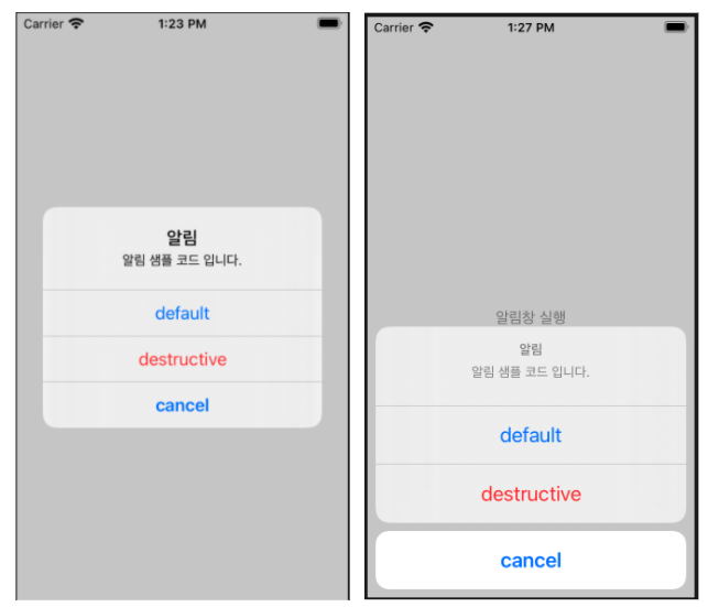 그림의 왼쪽이 알림창, 오른쪽이 액션 시트입니다. 알림창은 화면 중앙에 표시되고, 버튼이 두 개 이상이면 이를 가로로 나란히 배치합니다. 반면에 액션시트는 화면 하단에 표시되고, 버튼이 두 개이면 세로로 배치합니다.