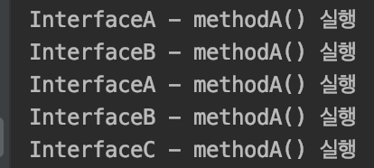 개발 코드가 인터페이스 메소드를 호출하면 인터페이스는 객체의 메소드를 호출한다. 객체는 인터페이스에서 정의된 추상 메소드와 동일한 메소드 이름, 매개 타입, 리턴 타입을 가진 실체 메소드를 가지고 있어야 한다.