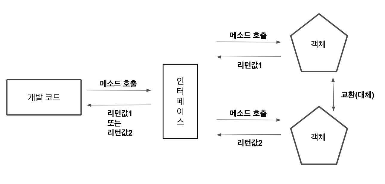 인터페이스는 하나의 객체가 아니라 여러 객체들과 사용이 가능하다. 때문에 개발 코드의 변경 없이 어떤 객체를 사용하느냐에 따라 실행 내용과 리턴값을 다양화 할 수 있는 장점이 있다.