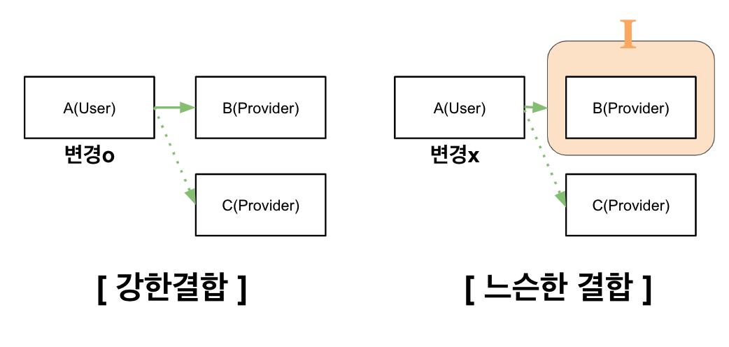 인터페이스를 이용해서 강한 결합을 느슨한 결합으로 변경할 수 있다.