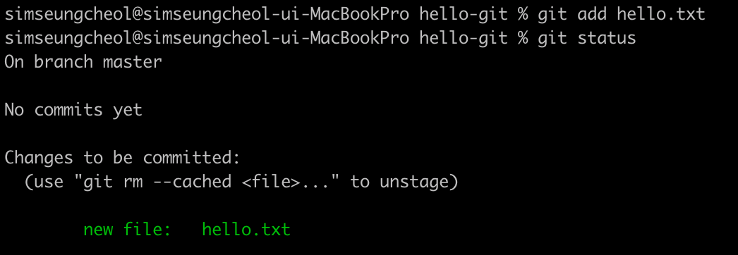 ‘Changes to be committed’은 커밋할 변경 사항이 있음을 알려준다. 이 메시지가 보이면 커밋 직전 단계인 staged 상태이다.