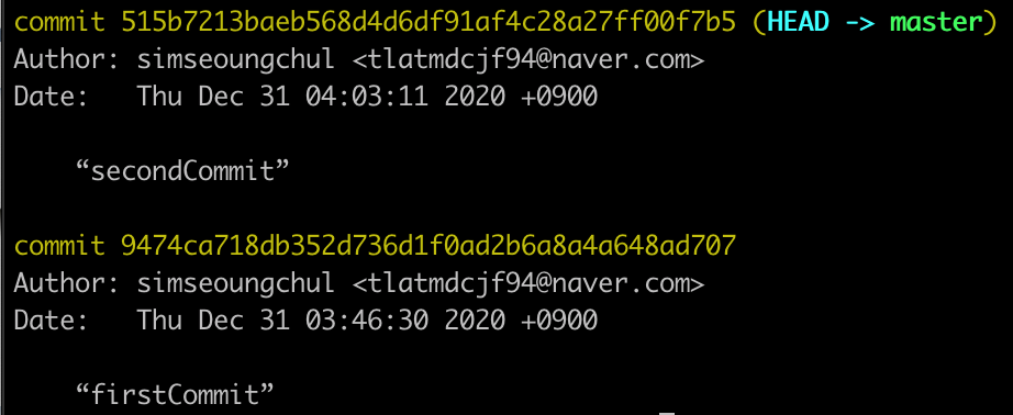 git log를 통해 커밋한 내용을 확인하면, 두 번째 버전의 정보를 볼 수 있다.