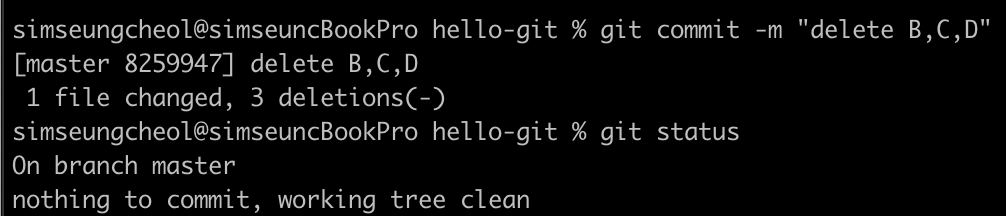 그리고 hello.txt 파일 앞에 modified: 라고 표시 되어 있어 파일이 수정된 것을 확인할 수 있다. 깃은 한 번 이라도 커밋 한 파일의 수정 여부를 계속 추적하며, 깃이 추적하고 있다는 뜻에서 tracked 파일이라 부른다.