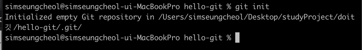 이 디렉터리에 저장소를 만들기 위해 터미널에서 git init 명령을 입력한다.