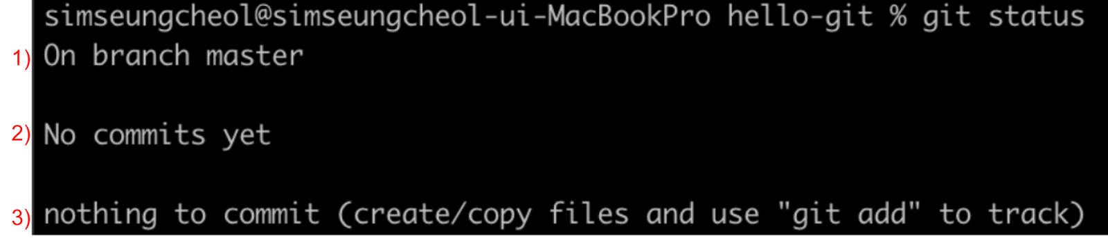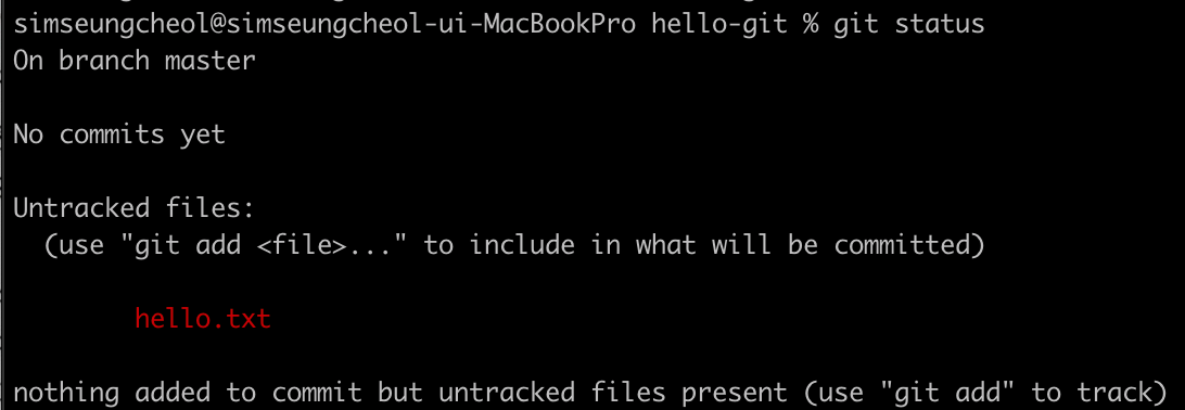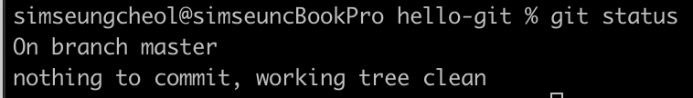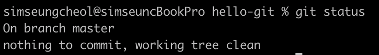 터미널 창에서 기존에 만든 hello-git 디렉터리로 이동한다. 깃 상태를 확인하기 위해 다음과 같이 입력한다.