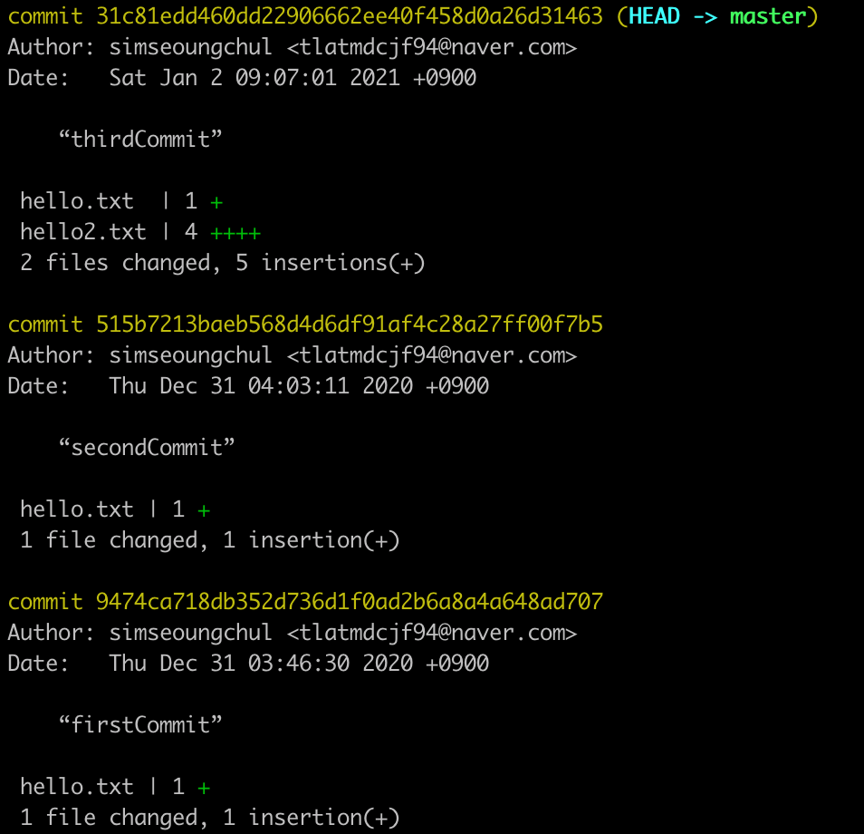 이제 커밋을 요청하고, 로그를 확인하자. git log 명령에 --stat 옵션을 사용하면 커밋에 관련된 파일까지 함께 살펴볼 수 있다.