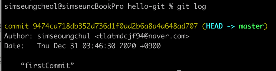 메시지를 확인하면, 방금 커밋한 버전에 대한 설명이 보인다. 커밋을 만든 사람, 만든 시간과 커밋 메시지가 함께 나타난다. commit 옆에 붙어있는 숫자와 알파벳 조합은 ‘커밋 해시’ 또는 ‘깃 해시’라고 부르며, 커밋을 구별하는 아이디 역할을 한다.