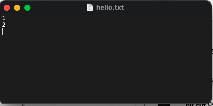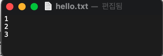 hello.txt 파일을 열어 숫자 2을 추가한다.