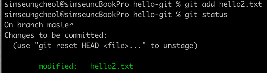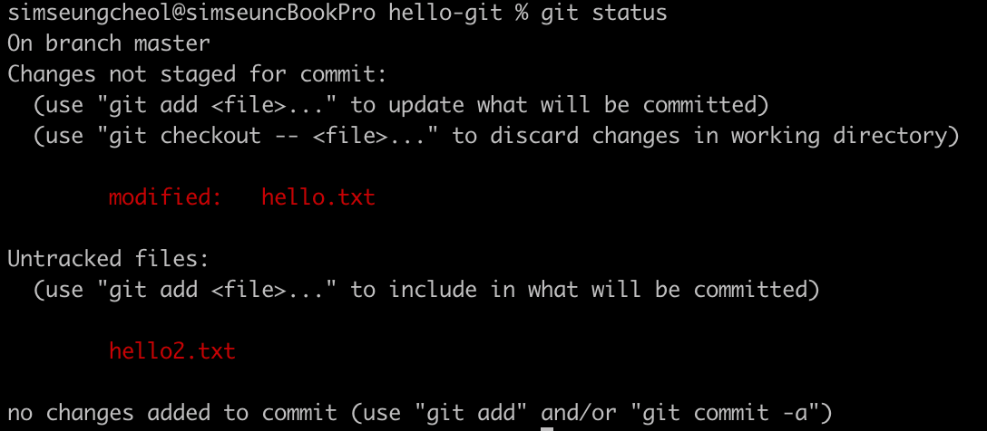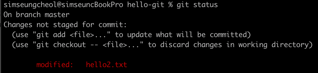 hello2.txt 파일이 수정되었고 아직 스테이지에 올라가지 않은 걸 알 수 있다. ‘Changes not stage for commit:’ 메시지는 파일이 수정된 modified 상태임을 알려준다.