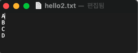 그리고 hello2.txt 라는 새로운 파일을 만들어 알파벳 A, B, C, D를 한 줄에 한 글자씩 입력하고, 저장한다.