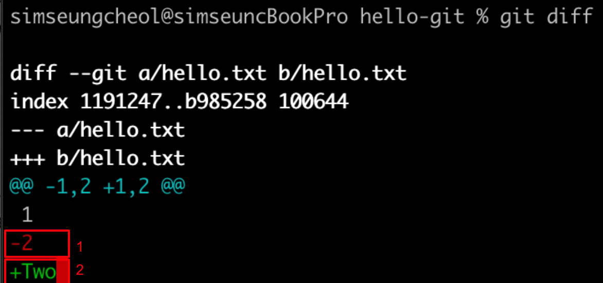 1에 나타난 빨간색 ‘-2’는 최신 버전과 비교할 때 hello.txt 파일에서 ‘2’가 삭제되었다는 뜻이다.