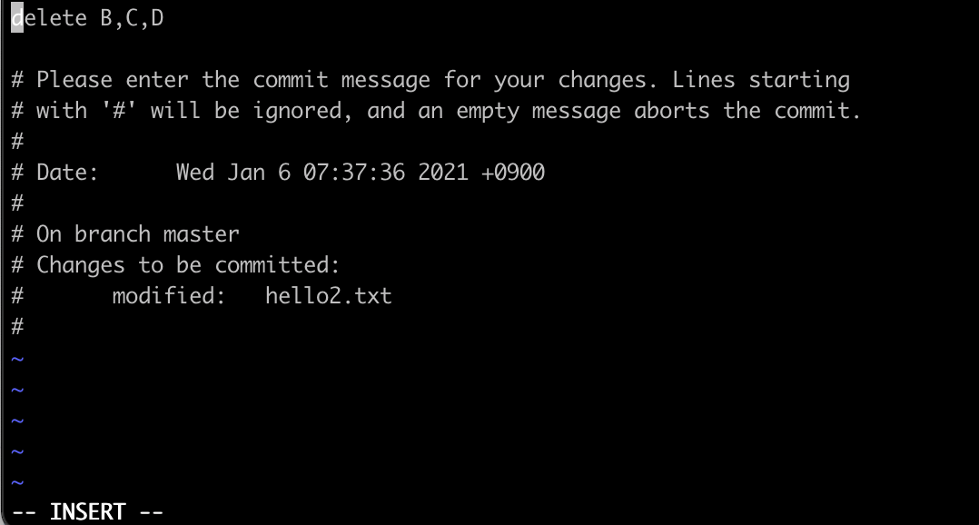 명령어를 입력하면 기본 편집기인 vim이 실행되면서 원래 커밋 메시지가 화면 위쪽에 나타난다. i를 눌러 입력 모드로 진입하여 메시지를 수정할 수 있다.