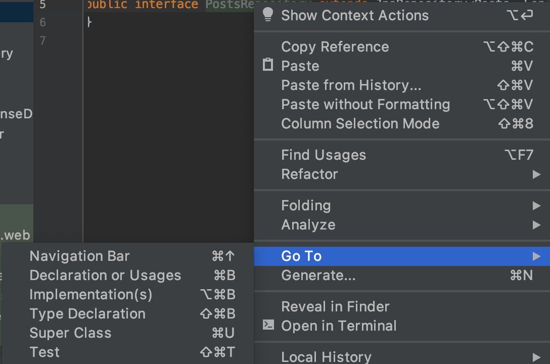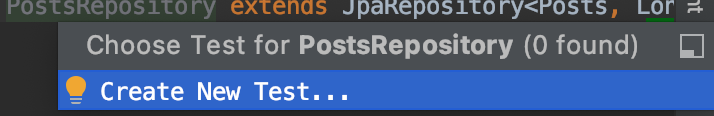 ⭐PostsRepository 클래스 이름에 대고 마우스 오른쪽을 눌러 Go To - Test - Create New Test버튼을 클릭한다.
