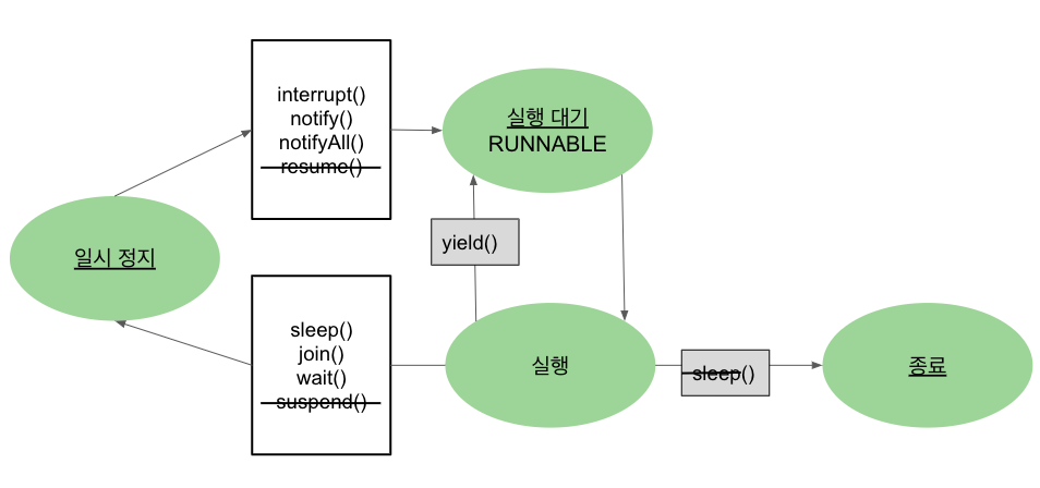 실행 중인 스레드의 상태를 변경하는 것을 스레드 상태 제어라고 한다. 아래 그림은 상태 변화를 가져오는 메소드의 종류를 보여준다. 취소선(-)을 가진 메소드는 스레드의 안전성을 해치어 더 이상 사용하지 않도록 권장되는 Deprecated 메소드들이다.