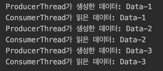System.out.println("ProducerThread가 생성한 데이터: "+data);