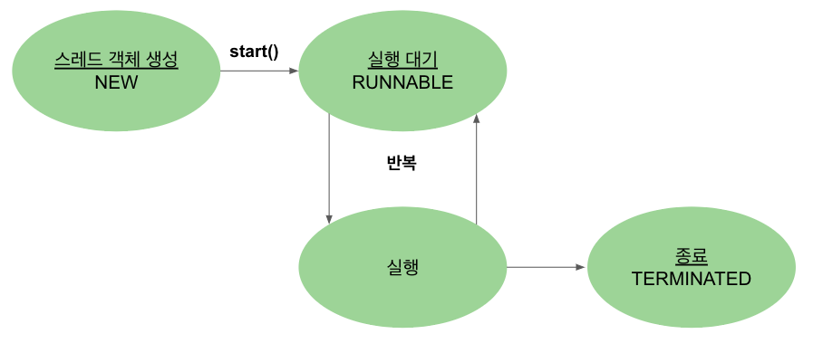 | 객체 생성 | NEW | 스레드 객체가 생성 후, 아직 start() 메소드가 호출되지 않은 상태 |