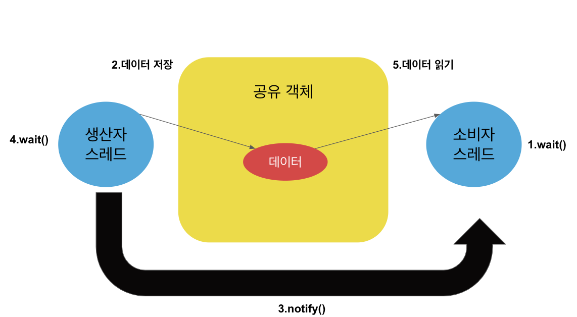 다음은 데이터를 저장하는 스레드(생산자 스레드)가 데이터를 저장하면, 데이터를 소비하는 스레드(소비자 스레드)가 데이터를 읽고 처리하는 교대 작업을 구현한다.