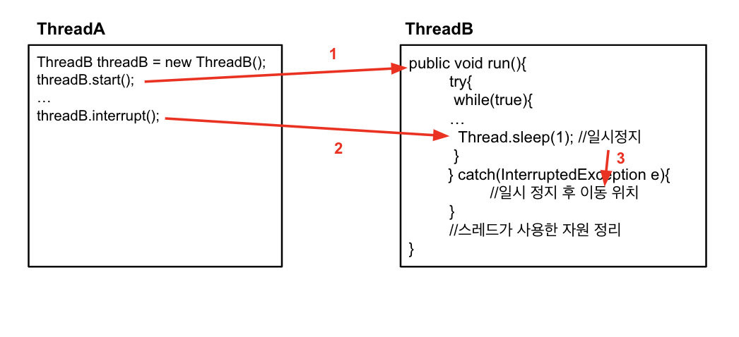 다음과 같이 ThreadA가 ThreadB의 interrupt() 메소드를 실행하면, ThreadB가 sleep() 메소드로 일시 정지 상태가 될 때 ThreadB에서 InterruptedException()이 발생하여 예외 처리(catch) 블록으로 이동한다.