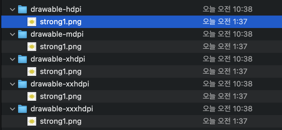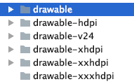 drawable 로 되어있는 폴더에 같은 이름의 파일을 각 폴더사이즈에 맞춰서 넣어주면, 안드로이드는 기기의 dpi와 가장 비슷한 레이아웃으로 자동으로 적용된다. 이때 적용되는 순서는 고밀도에서 저밀도 순으로 적용을 시도한다.